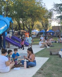 El humo de las parrillas colmaba el aire con su olor irresistible. Los puestos de feriantes ofrecían sus producciones ante la mirada tranquila y atenta de familias y grupos de jóvenes que disfrutaban a pesar de las nubes y el fresco. También se veían por todos lados a niños y niñas que celebraban su día. Toda una comunidad reunida en un día de celebración y encuentro.