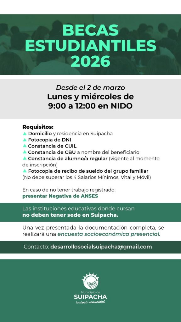 La Municipalidad de Suipacha sigue adelante con políticas positivas en el área educativa y a partir del lunes estará abierta la inscripción para las Becas Estudiantiles 2026.